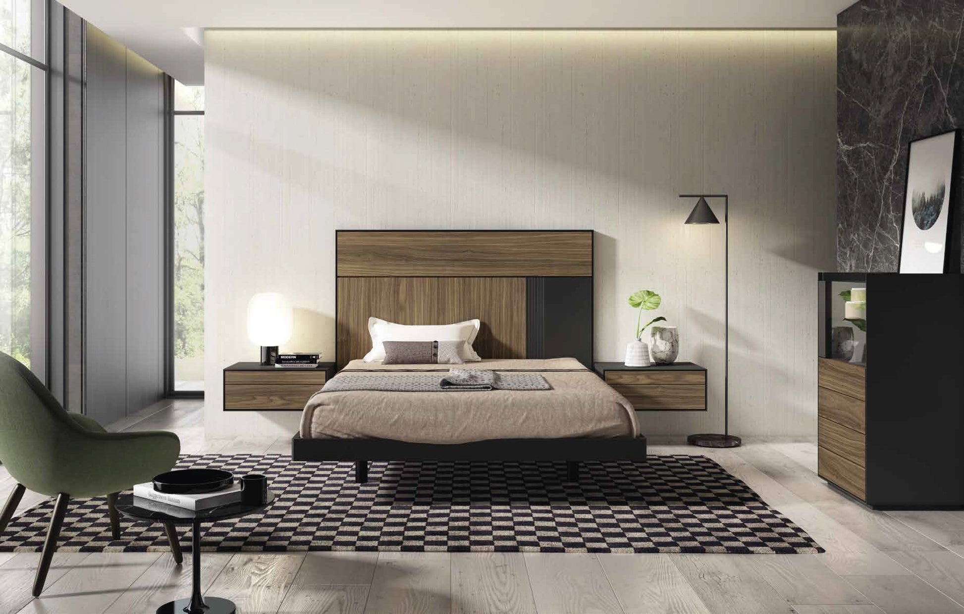 Dormitorio matrimonio compuesto de cabezal, dos mesitas colgadas de 66 cm, bancada para colchón de 150x190 y sinfonier.