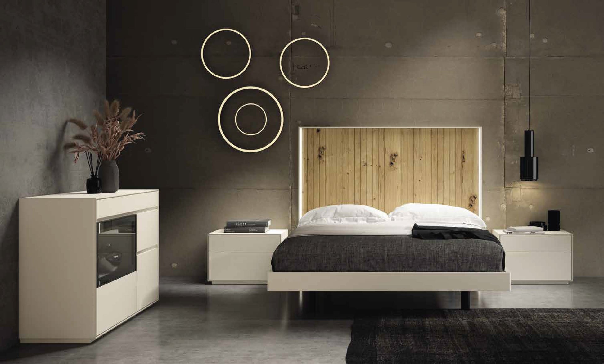 Dormitorio matrimonio compuesto de cabezal, dos mesitas, cómoda y bancada para colchón de 150x190.