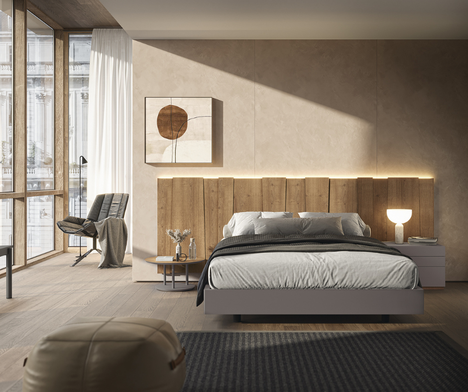 Dormitorio matrimonio compuesto de panel, dos mesitas y bancada para colchón de 150x190.