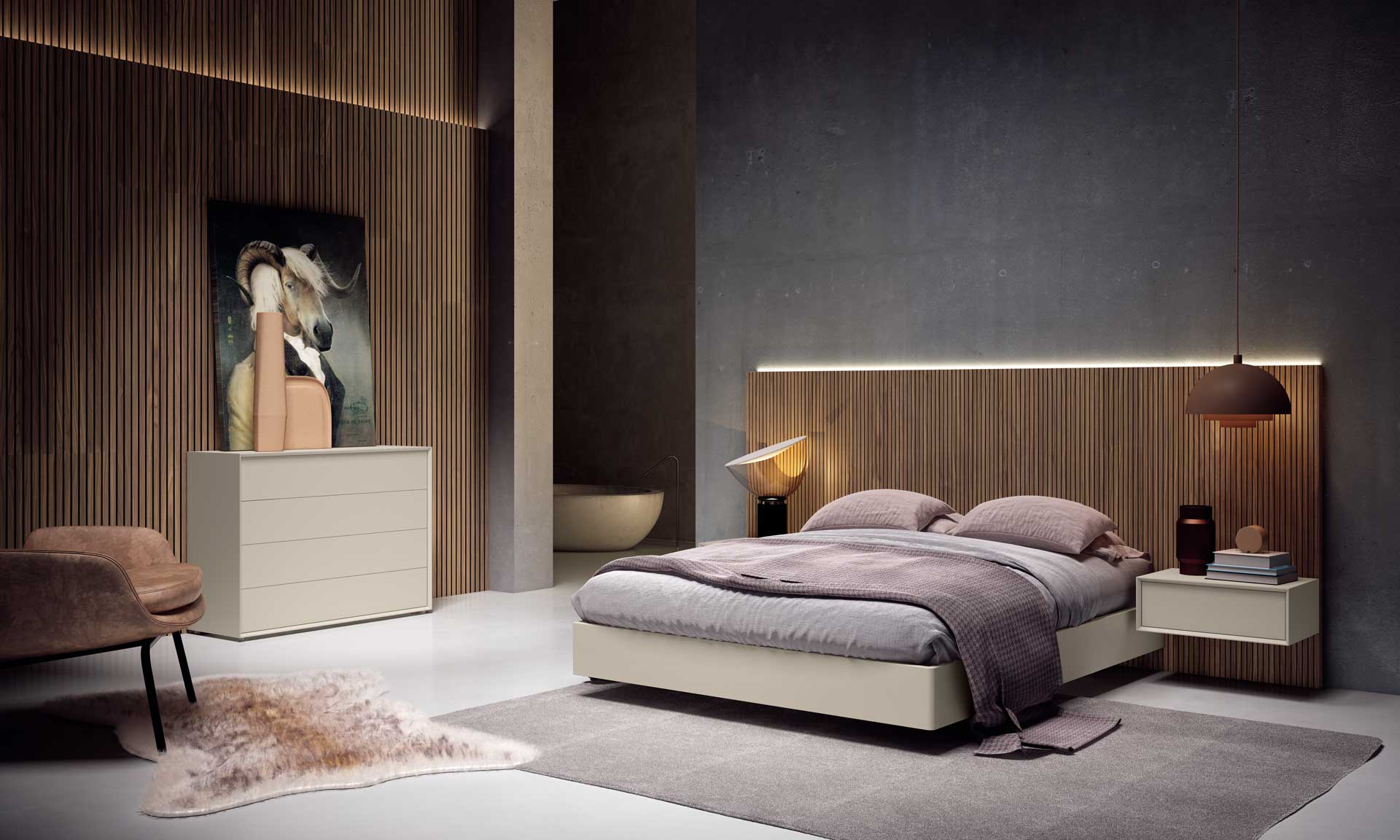 Dormitorio matrimonio compuesto de panel , dos mesitas, cómoda y bañera para colchón de 150x190.