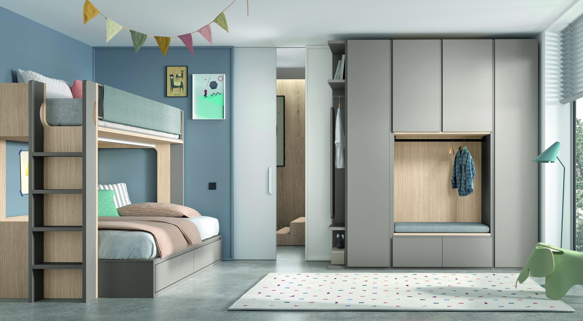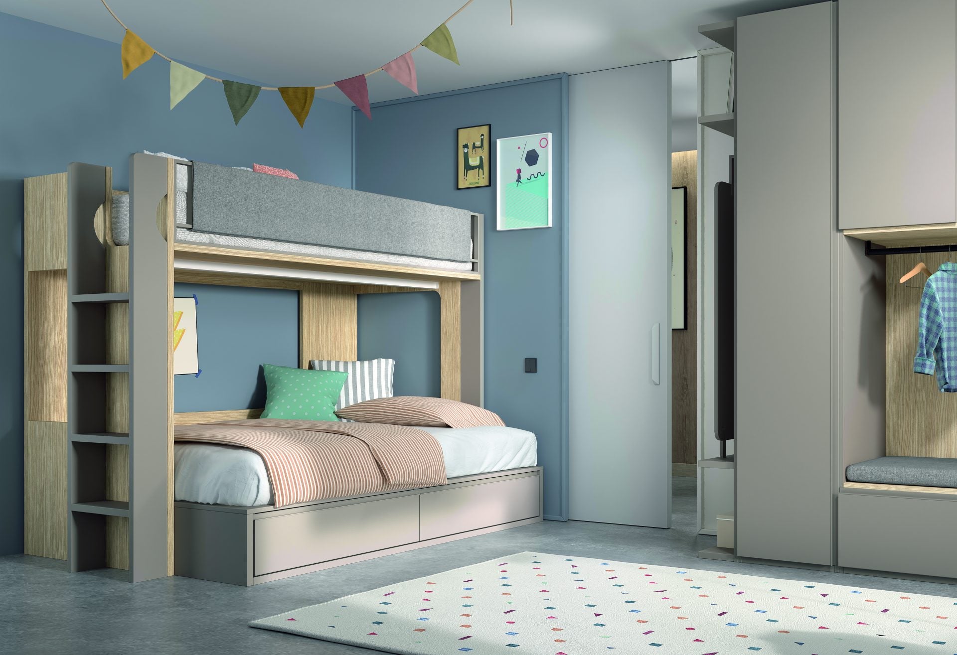 Dormitorio juvenil compuesto por litera bicolor con cama inferior para colchón de 135x190 con dos baules y arcón trasero, escalera y quitamiedos tapizado con armario.