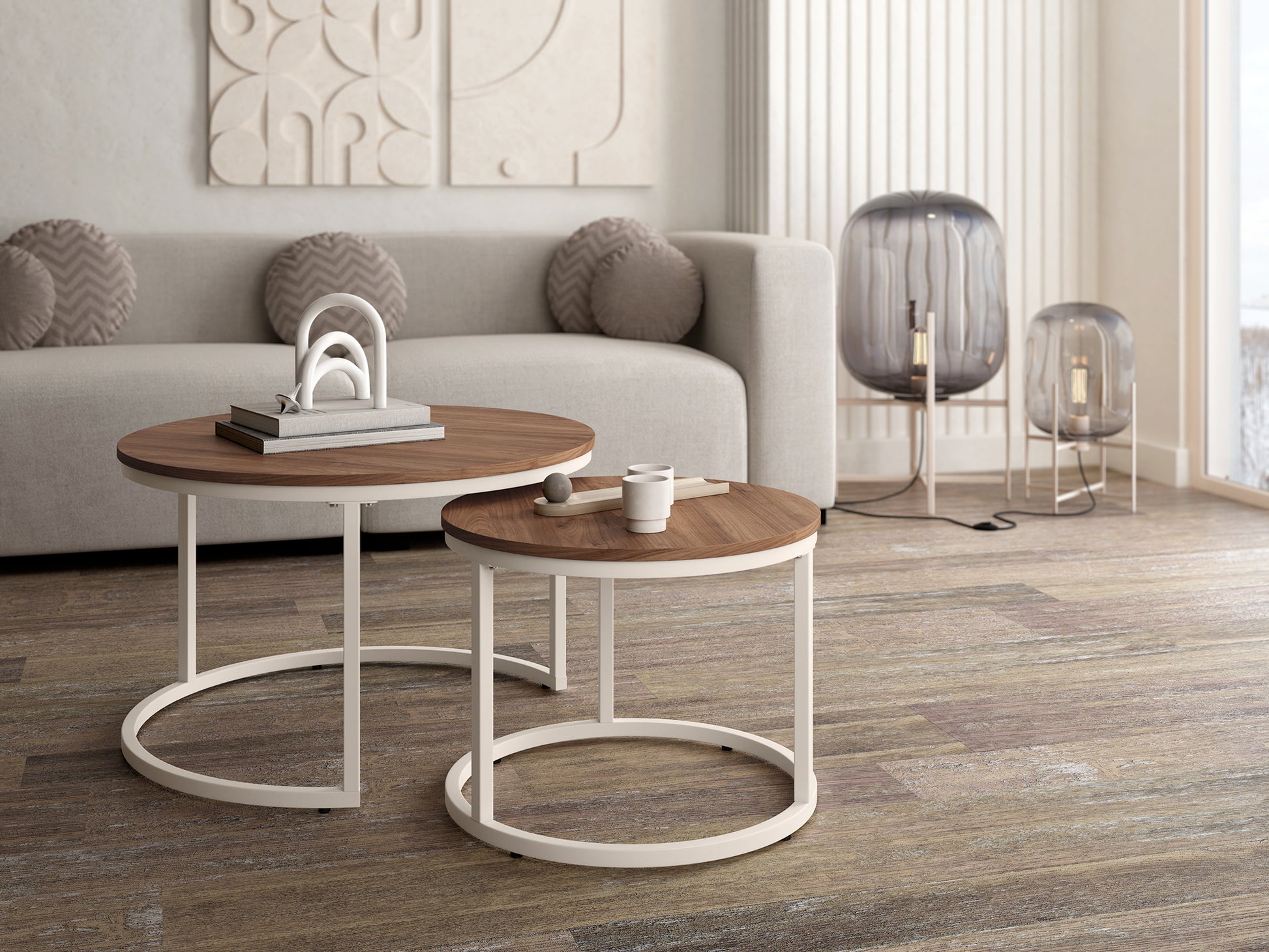 Pareja de mesas de centro de 70x 44 cm de altura y 50x39 cm de altura tapas en java y estructura metálicas marfil.