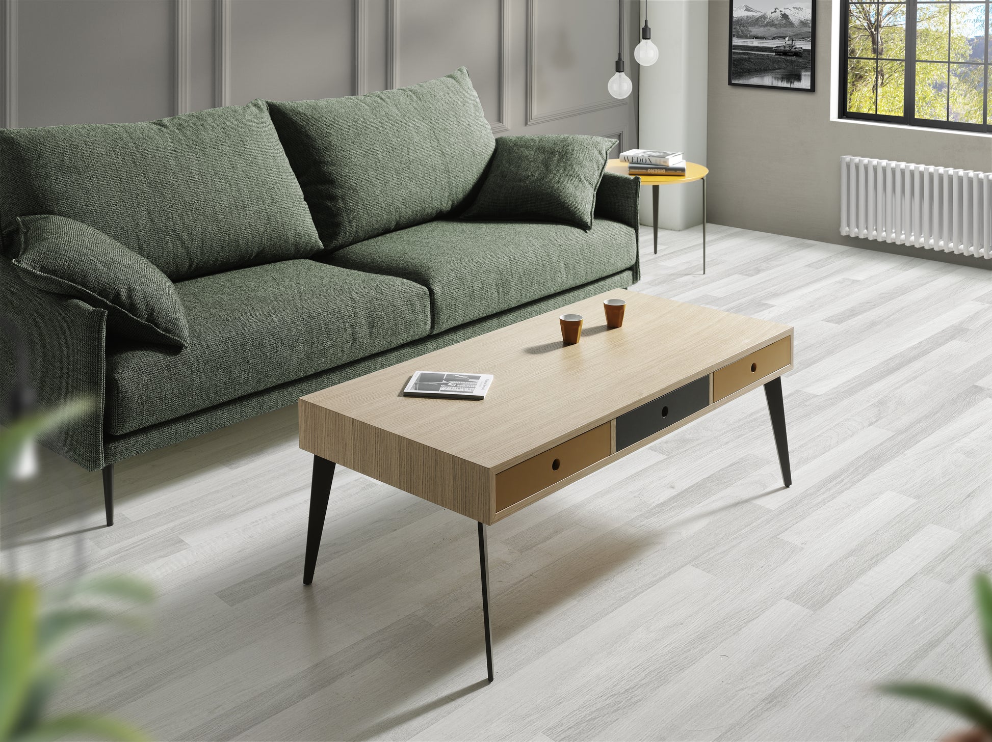 Mesa centro de 125x65x45 cm fija con cajones. Patas en acero negro.