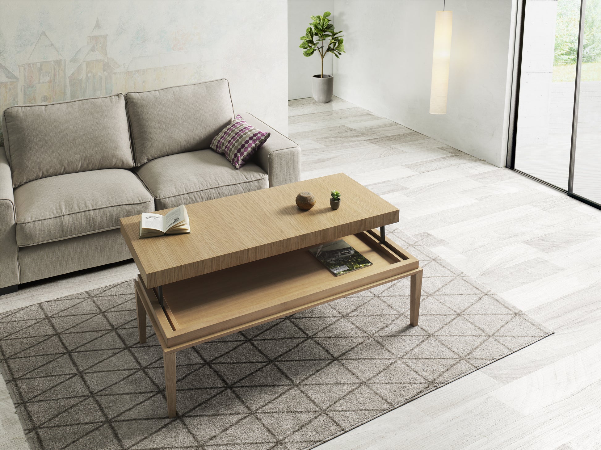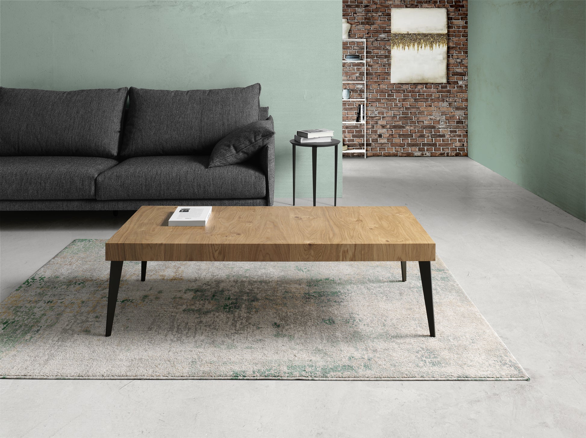 Mesa centro de 140x60x41 cm elevable. Patas en acero negro.