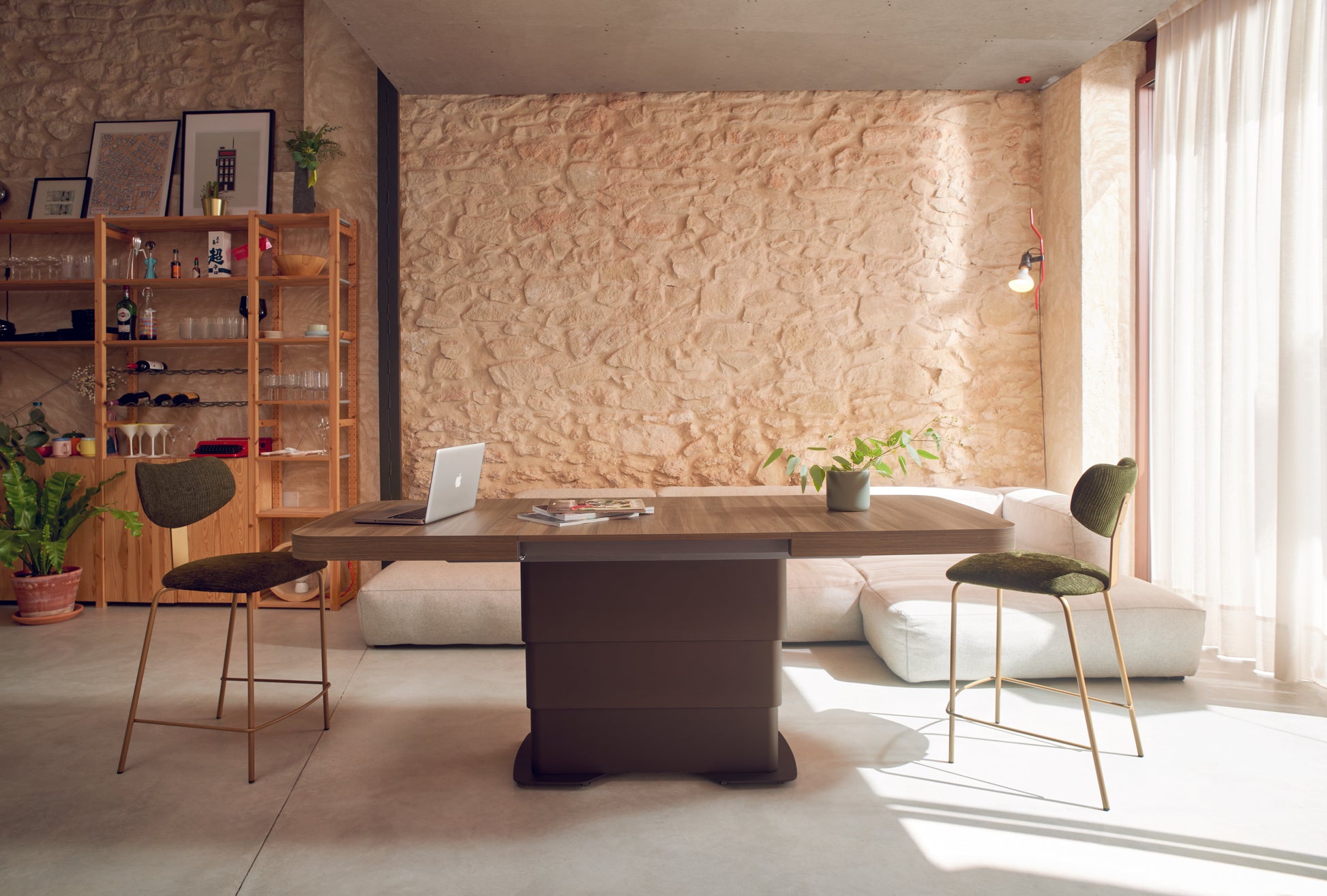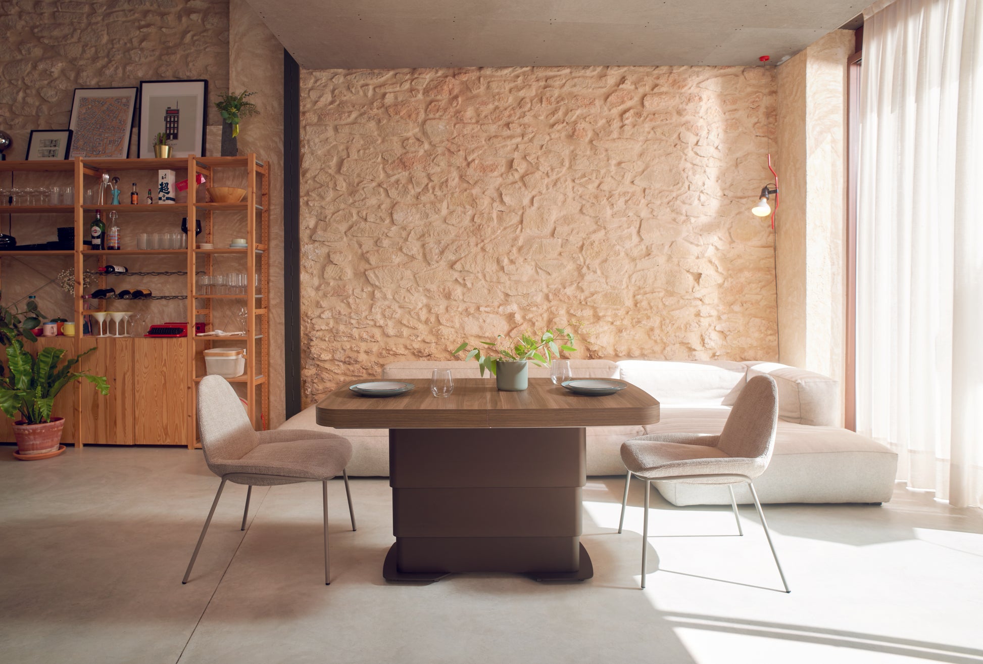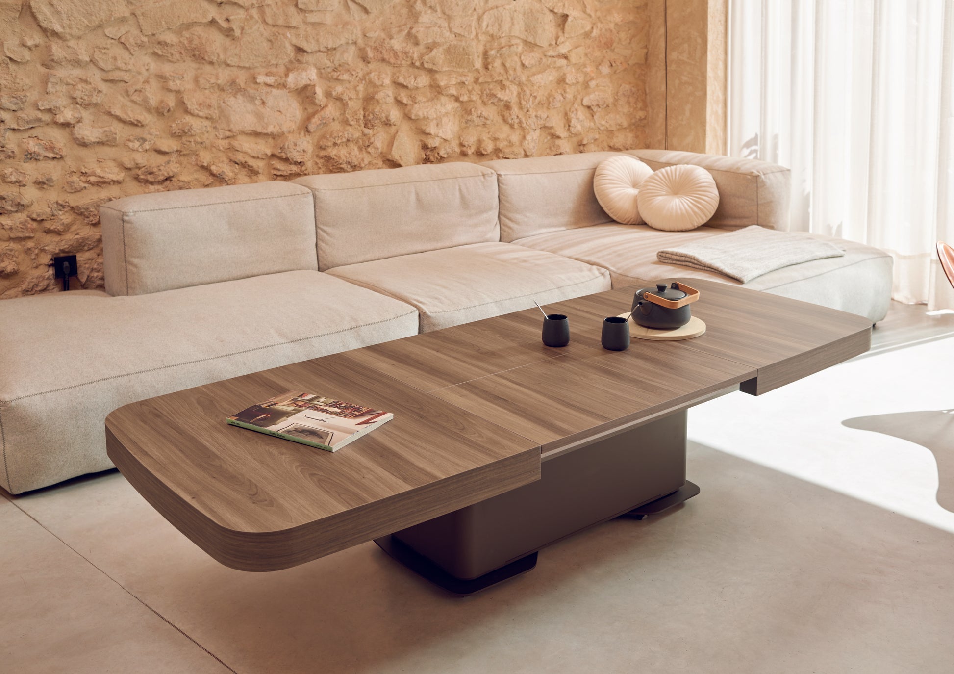 Mes centro convertible en comedor de 120x75 cm, abierta a 190x75cm, tapa en nogal y pata metálica visón.