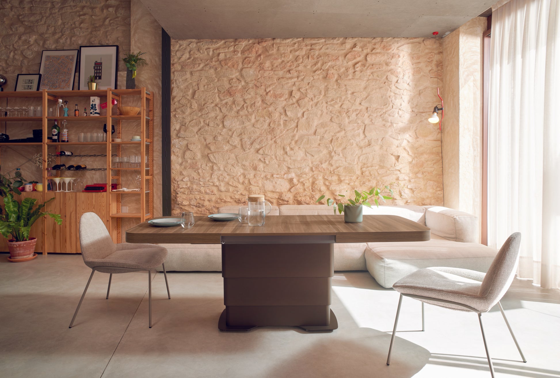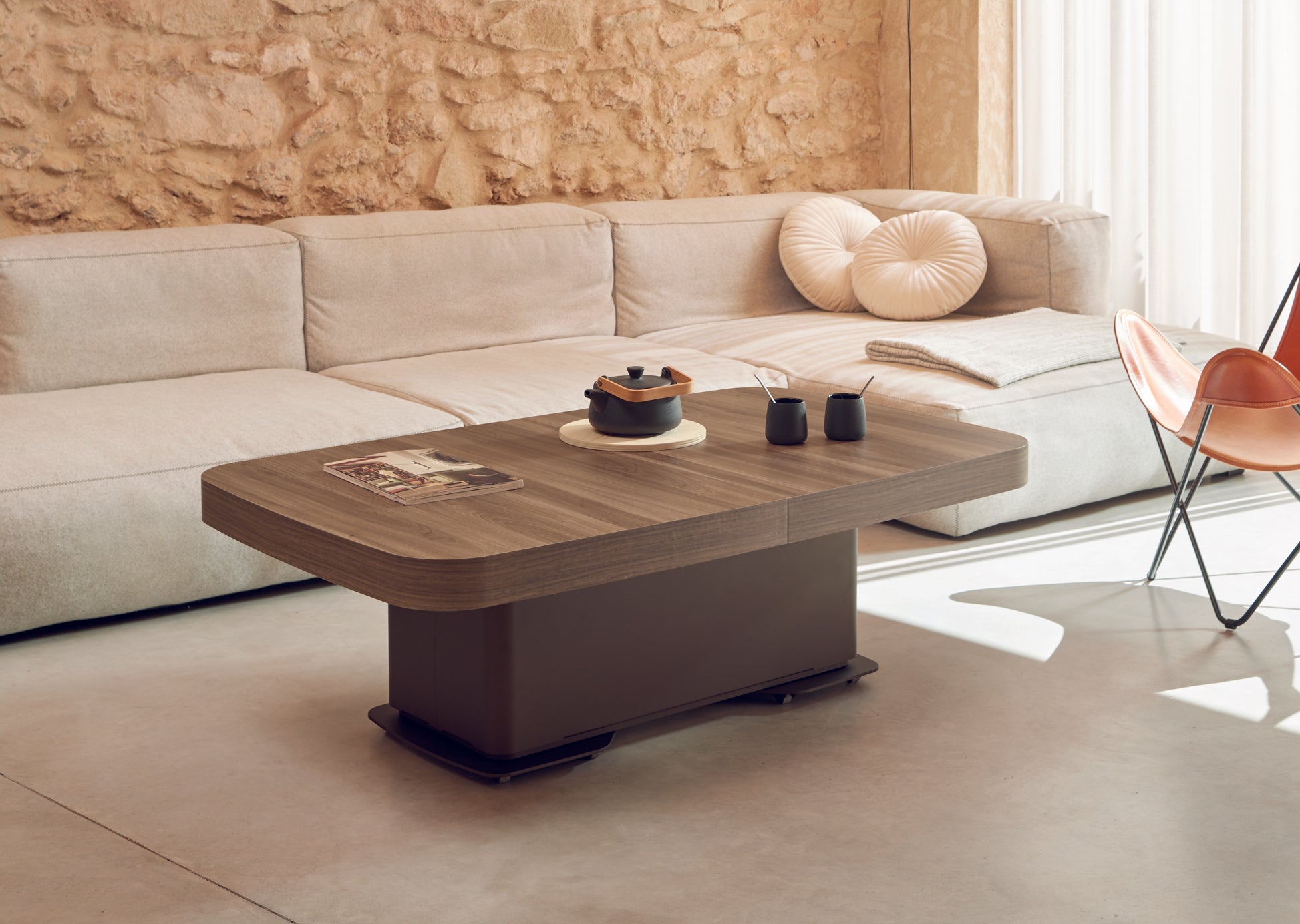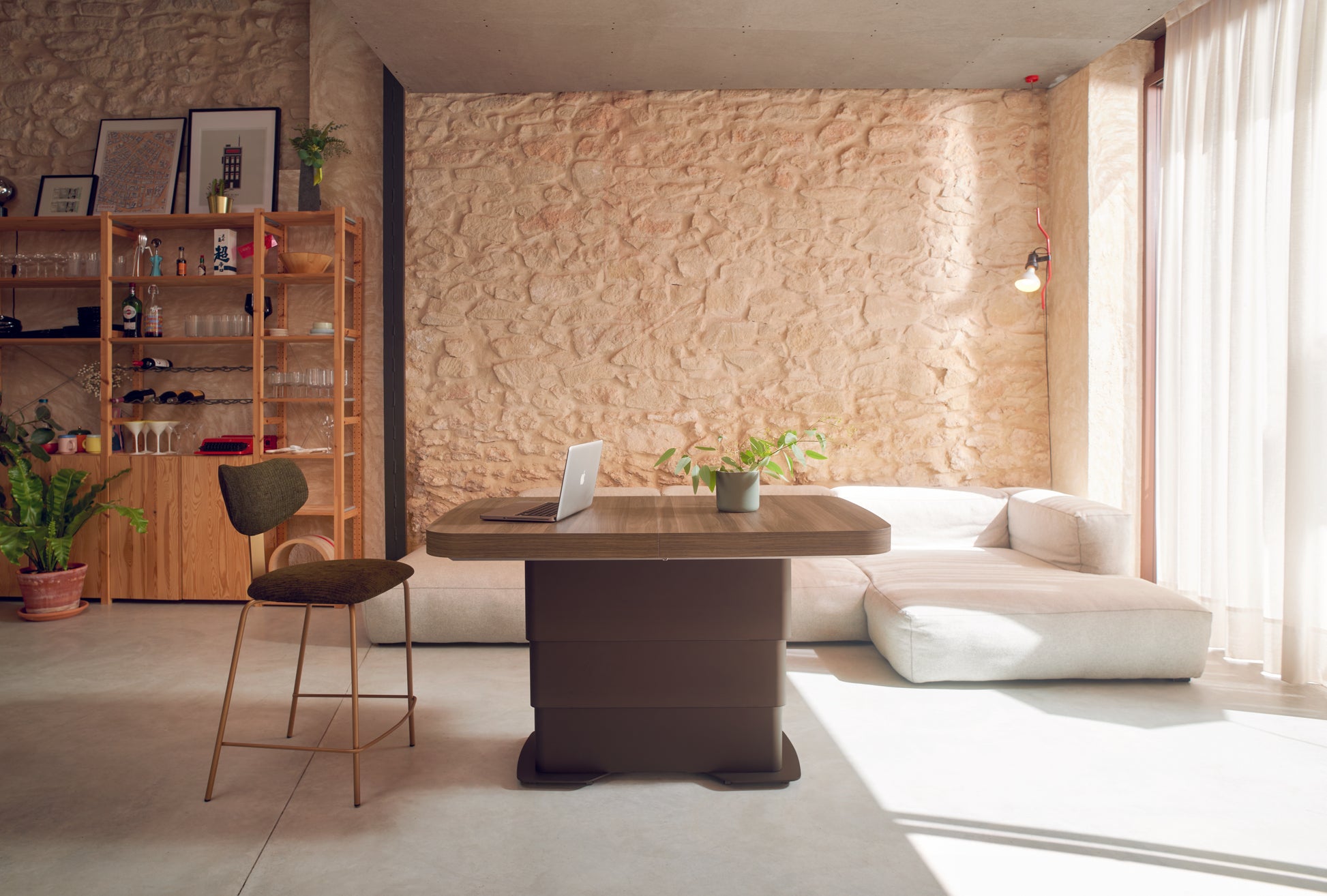 Mes centro convertible en comedor de 120x75 cm, abierta a 190x75cm, tapa en nogal y pata metálica visón.