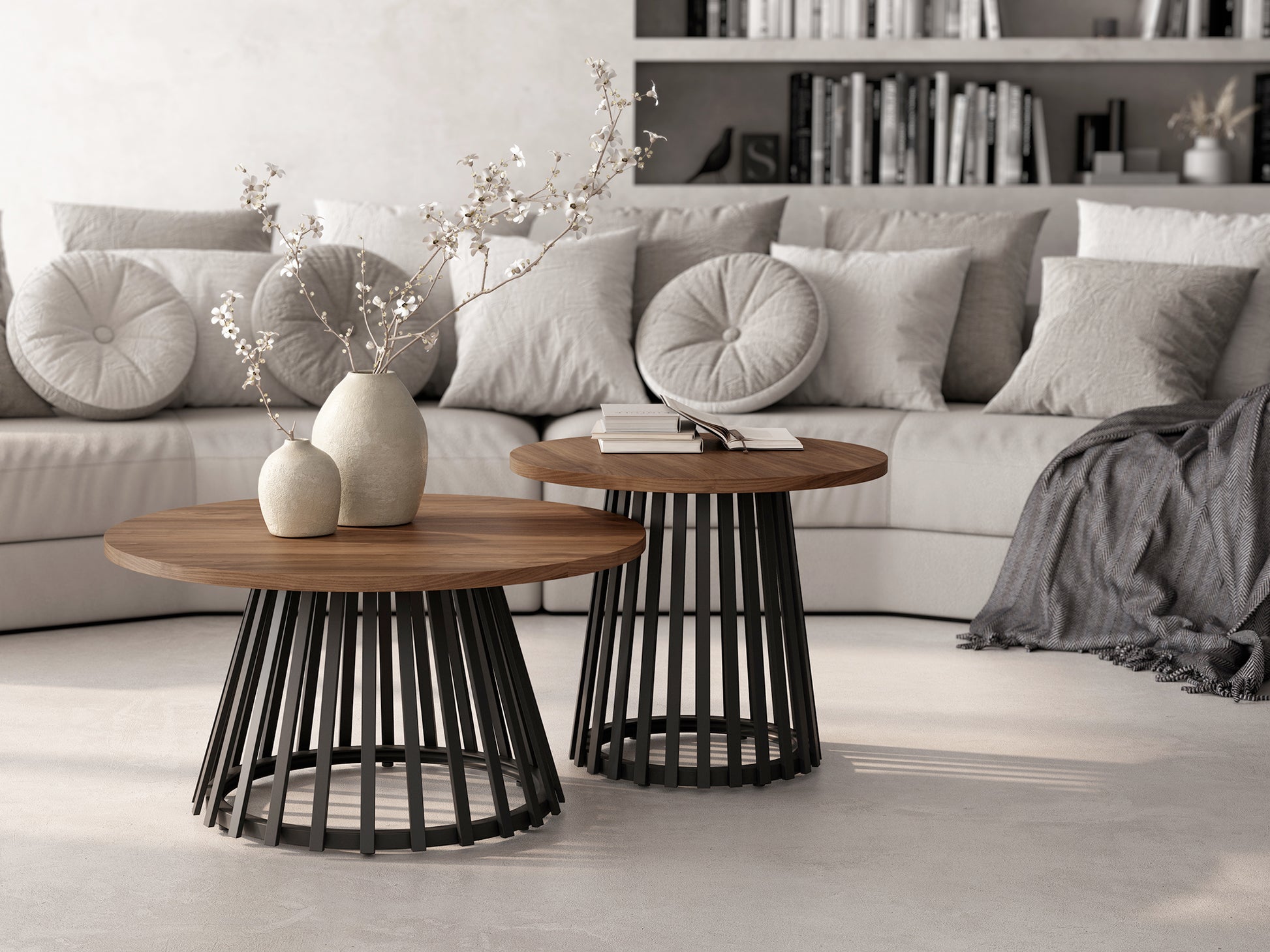 Pareja de mesas de centro de 80x 42 cm de altura y 60x50 cm de altura tapas en java y estructura metálicas negras.