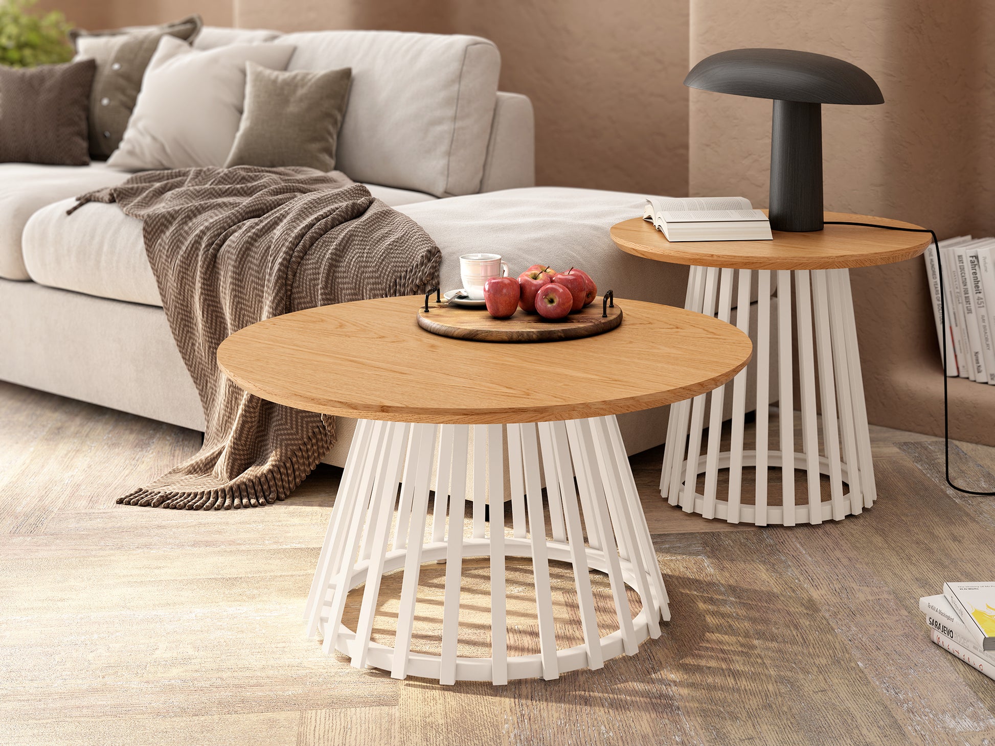 Mesas de centro redonda de 80x 42 cm de altura y 60x50 cm de altura, tapa en roble natural y estructura metálica marfil.