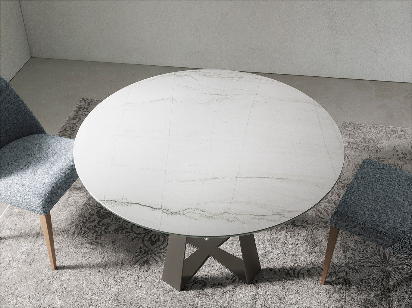 Mesa de comedor de 105 cm fija. Tapa en porcelánico y pie texturizado Vulcano Roca.