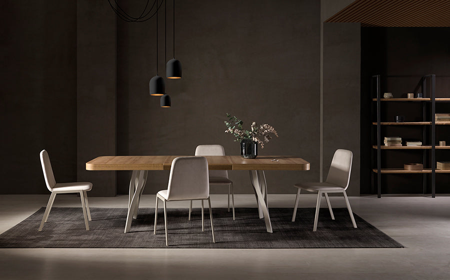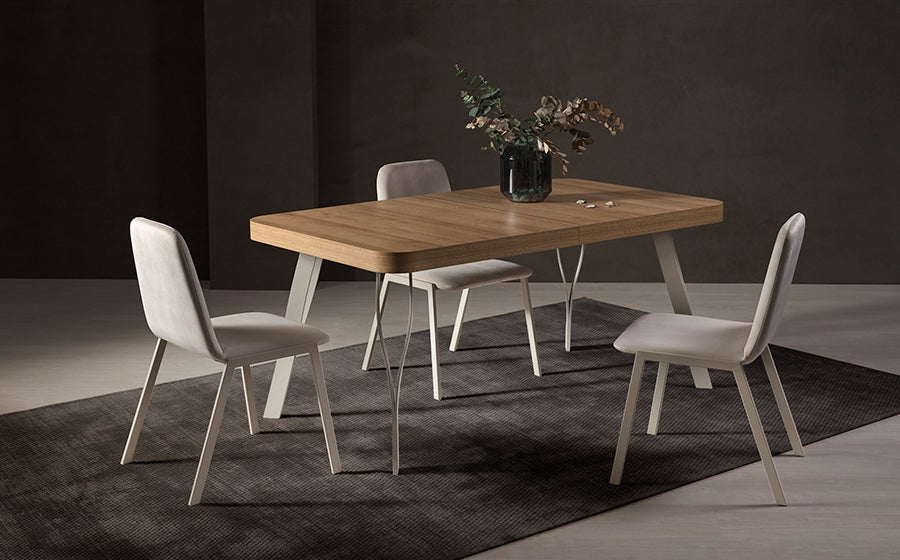Mesa de 160x90 cm extensible a 230x90 cm en tapa chapa madera y patas metálicas blancas.