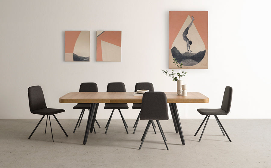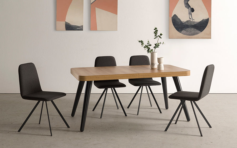 Mesa comedor de 140x90 cm extensible a 210x90 cm. En chapa de roble y patas lacadas negras.