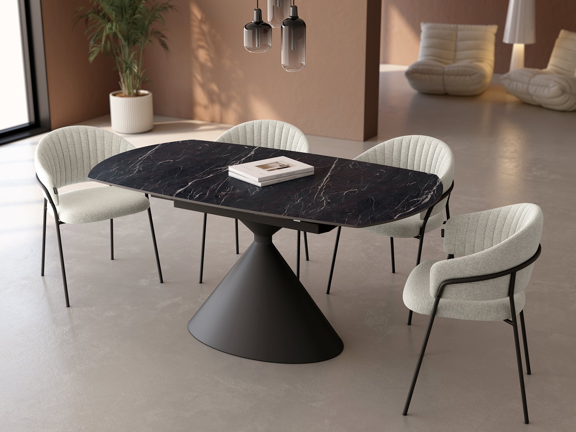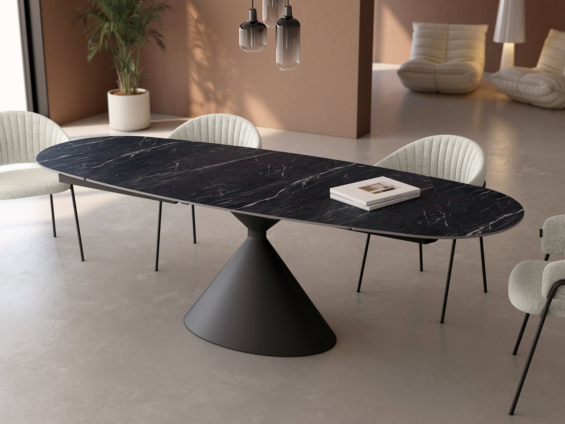 Mesa extensible ovalada tapa porcelánico marquina y estructura metálica negra. De 160x90extensible a 240x90