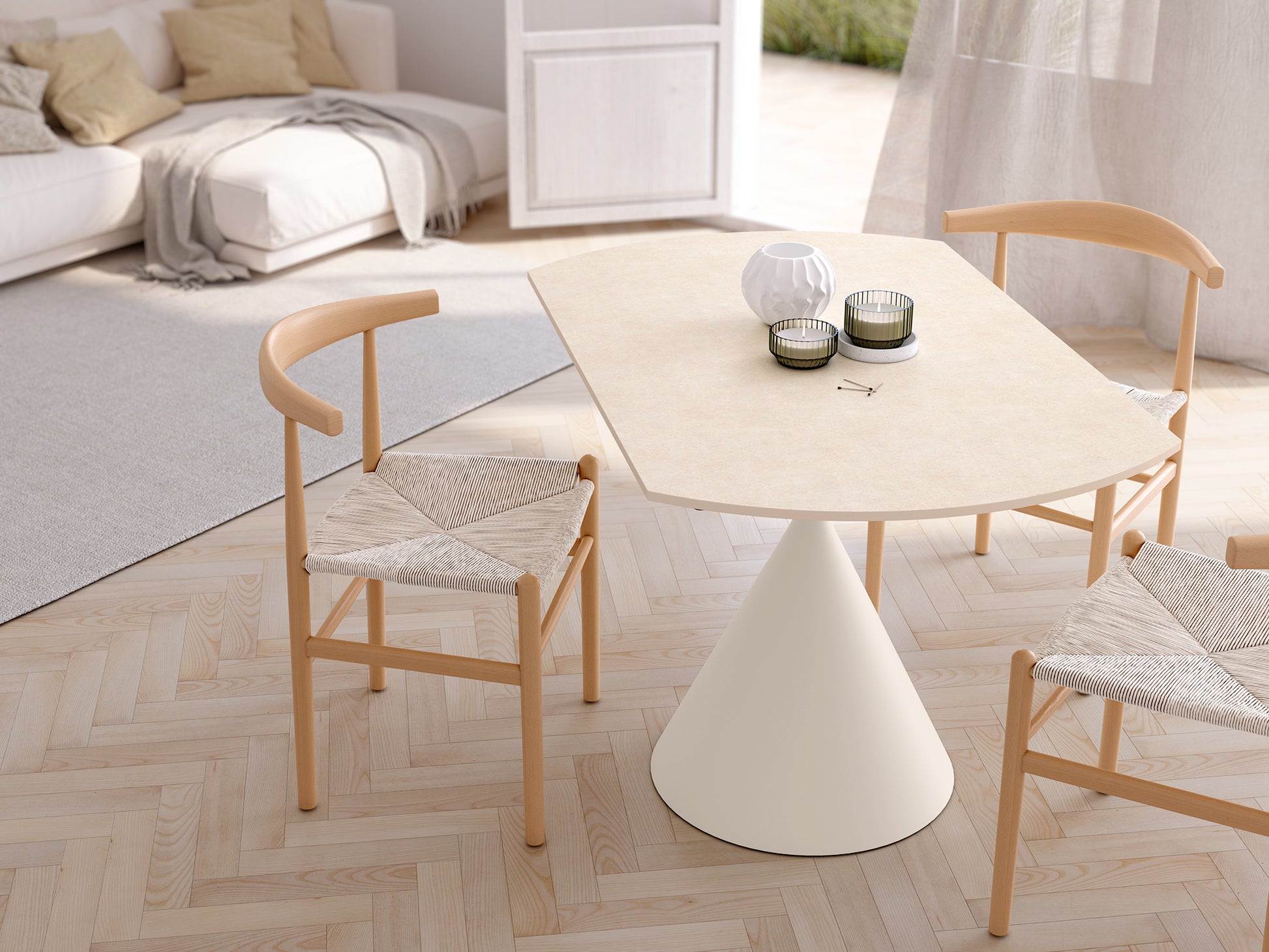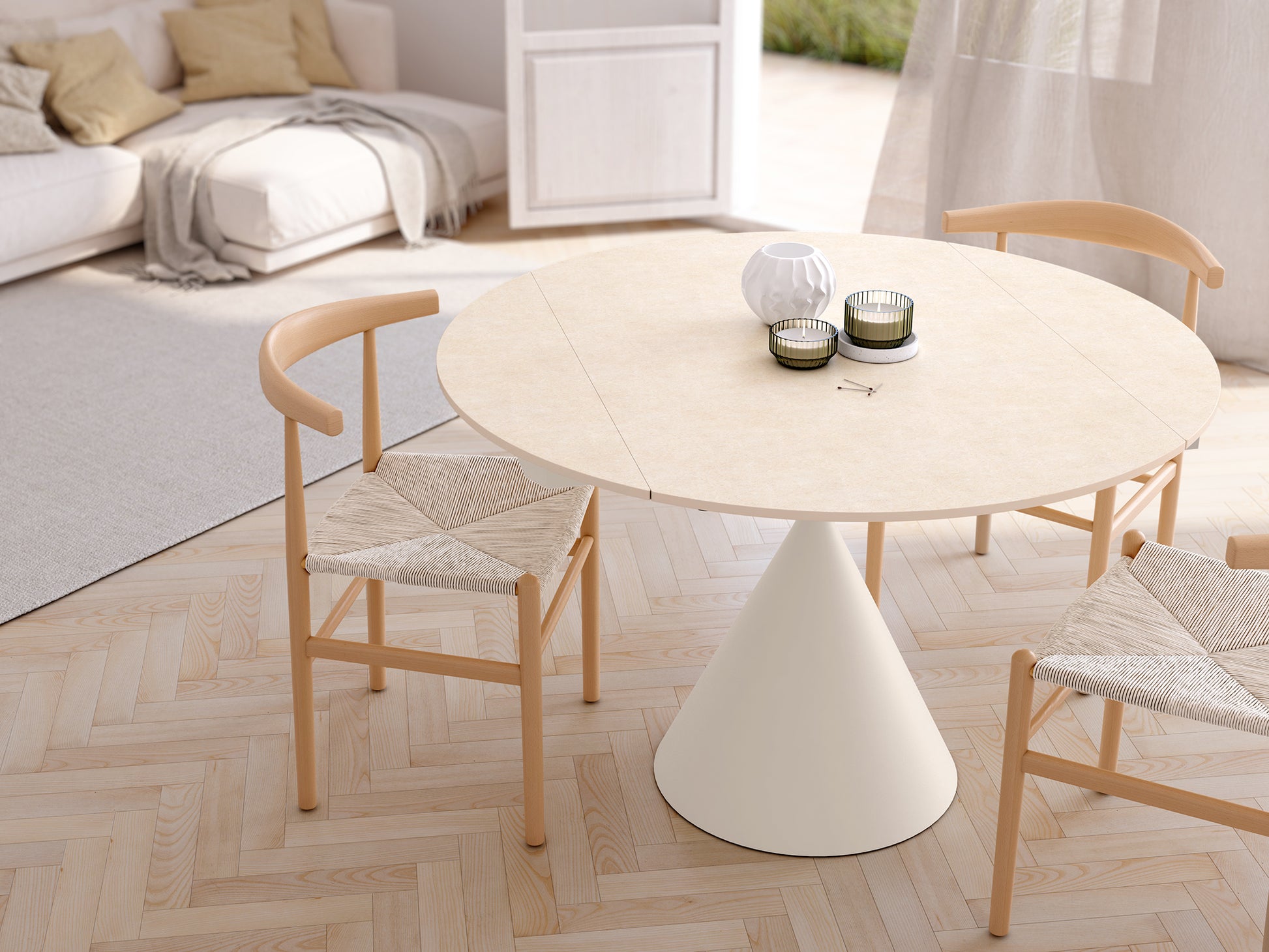 Mesa extensible a redonda tapa porcelánico arena y estructura metálica marfil. De 120x80 extensible a 120 cm de diámetro.