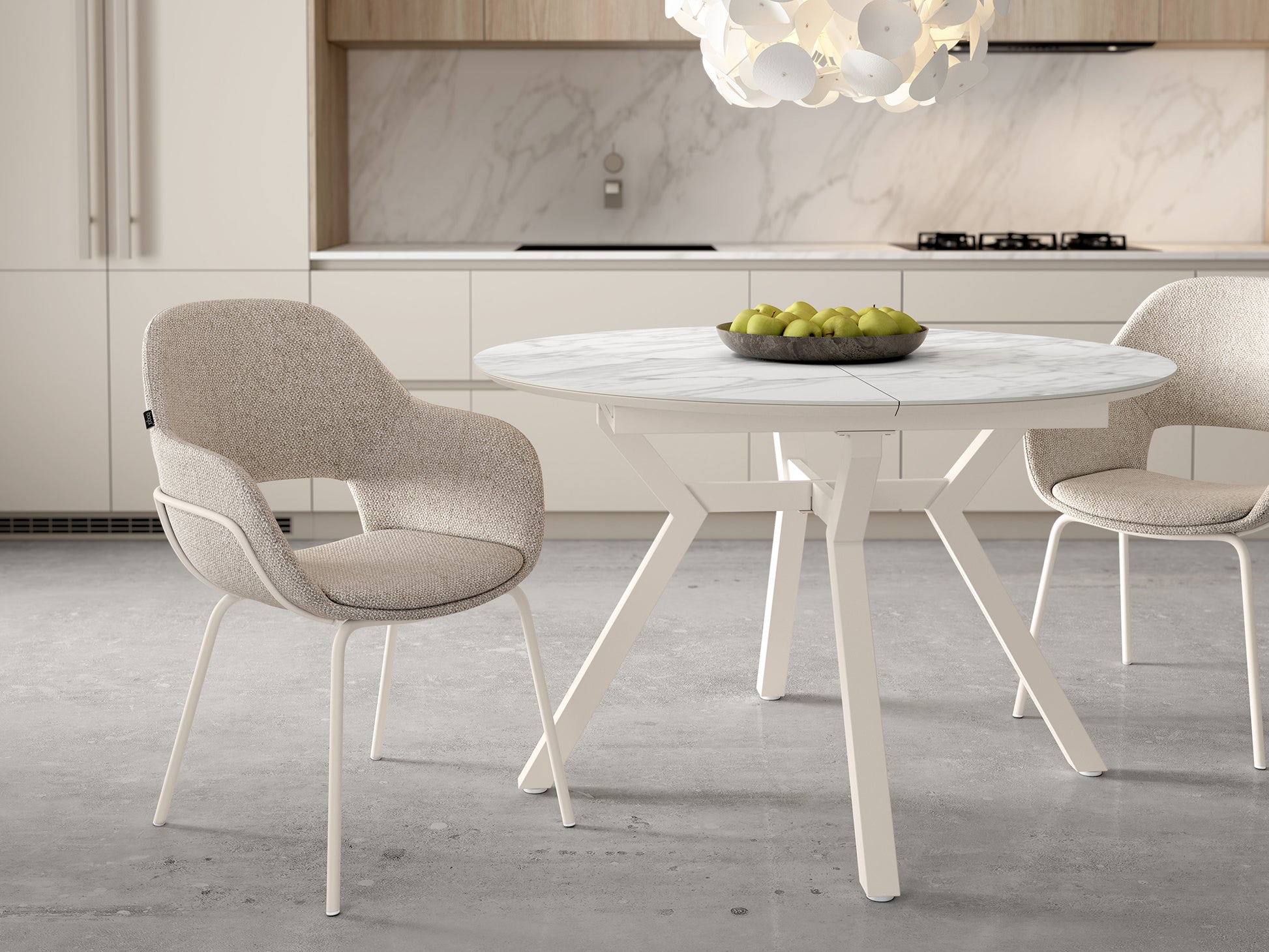 Mesa extensible redonda de 100 cm de diámetro, tapa porcelánico carrara y estructura metálica marfil. Extensible a 130x100 cm.