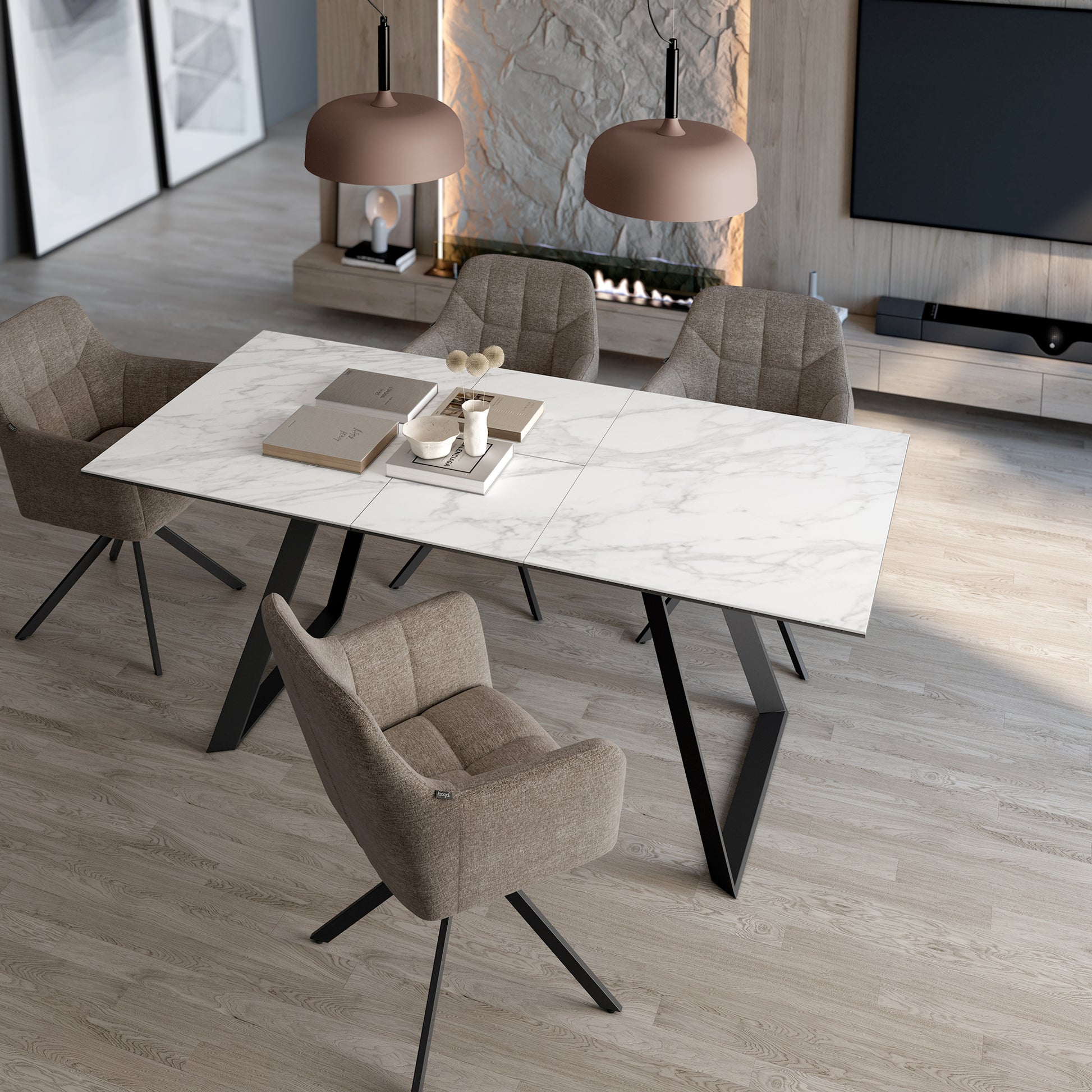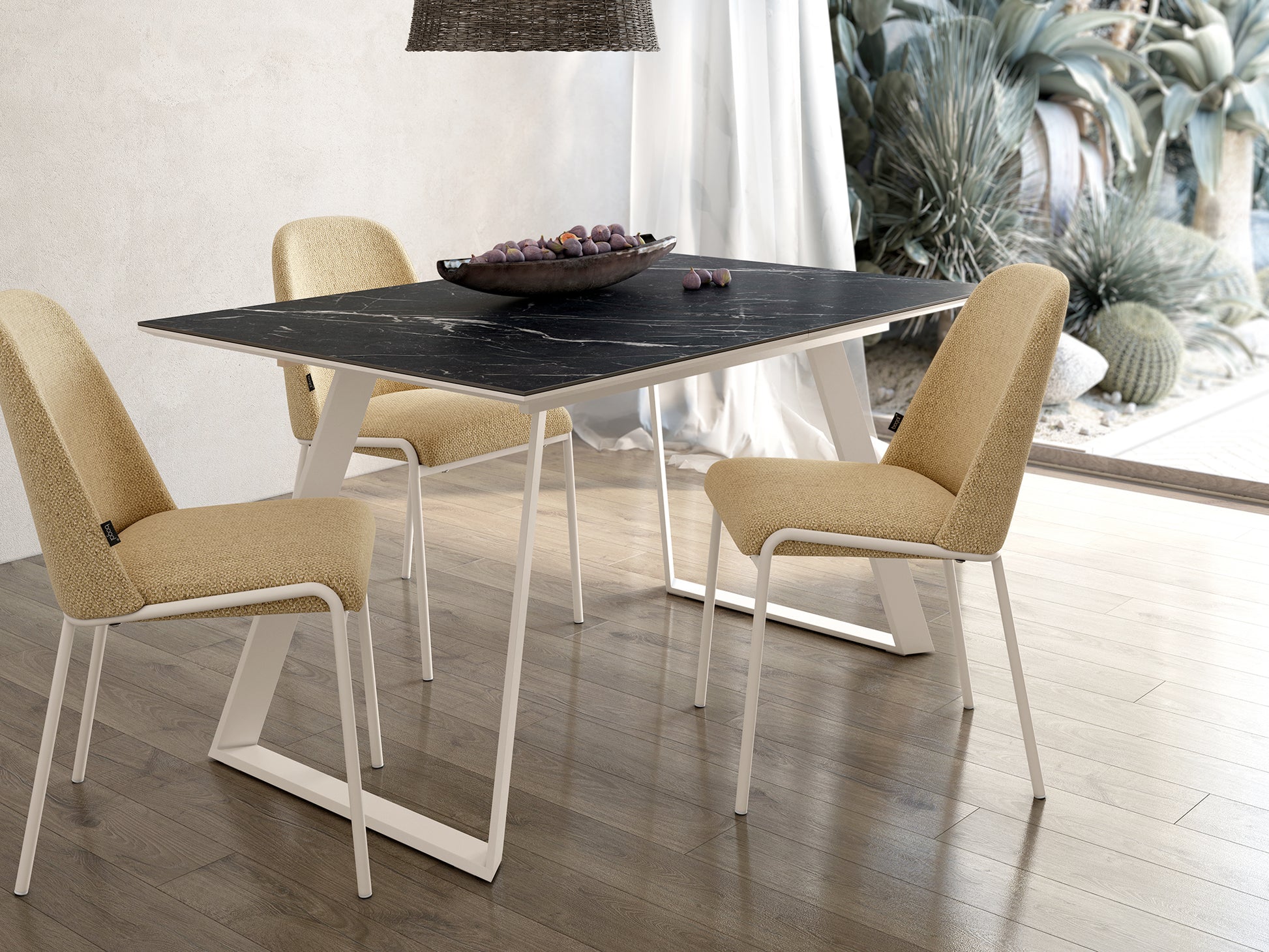 Mesa de 140x90 extensible a 180x90 cm, tapa porcelánico marquina y estructura metálica marfil.
