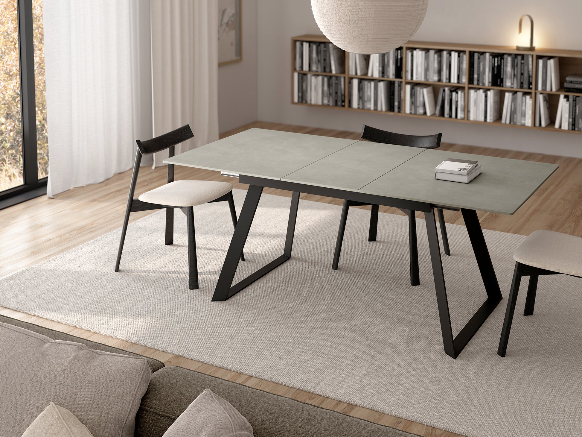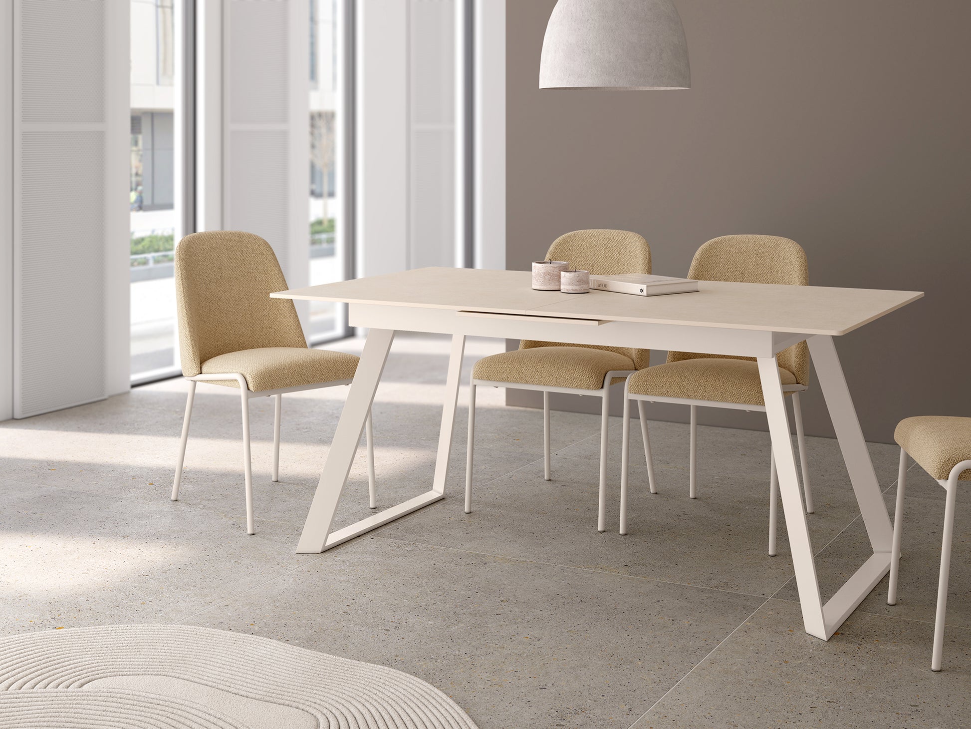 Mesa de 140x90 extensible a 180x90 cm, tapa porcelánico arena y estructura metálica marfil.