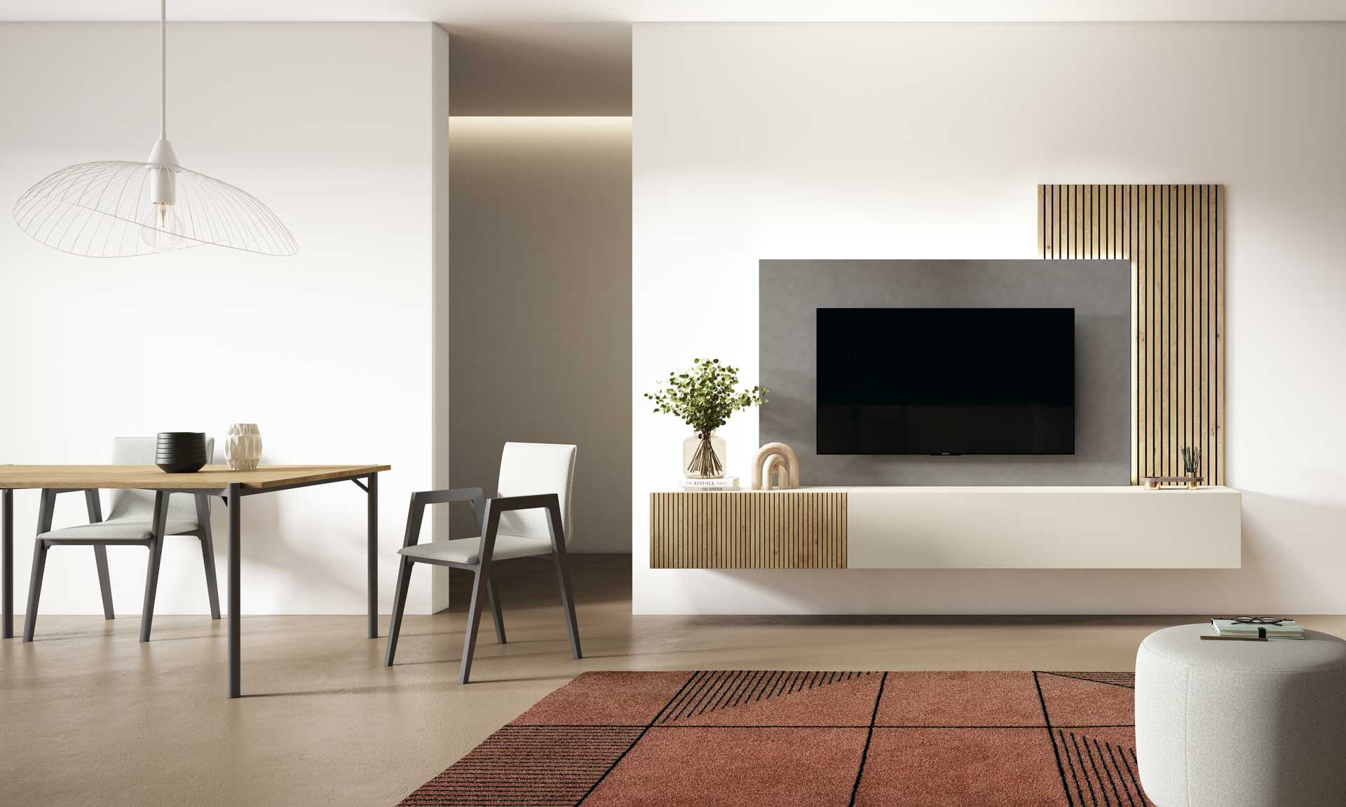 Apilable en visón, boreal roble hera y gris basalto colgado a pared.